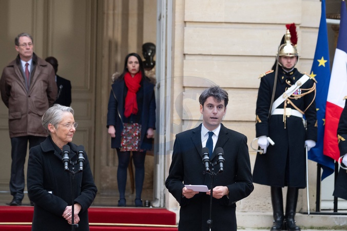 Przekazanie władzy pomiędzy byłą premier Elisabeth Borne a nowym premierem Gabrielem Attalem w Hôtel de Matignon w Paryżu.