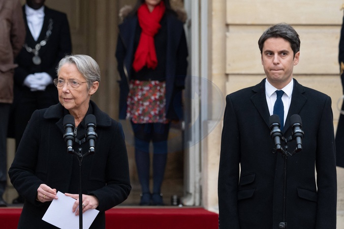 Przekazanie władzy pomiędzy byłą premier Elisabeth Borne a nowym premierem Gabrielem Attalem w Hôtel de Matignon w Paryżu.