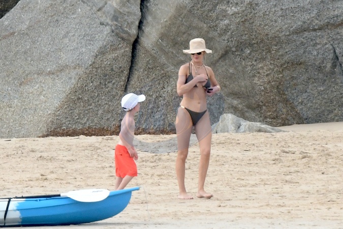 Exclusif - Prix spécial - No Web - Rosie Huntington-Whiteley fait un tour à jet-ski avec son fils Jack lors de leurs vacances à Phuket le 28 décembre 2023. Exclusive - No web For Germany call for price Rosie Huntington-Whiteley takes a jet-ski ride with her son Jack during their holiday in Phuket on 28 December 2023. — Please pixelate children face prior to publication —
