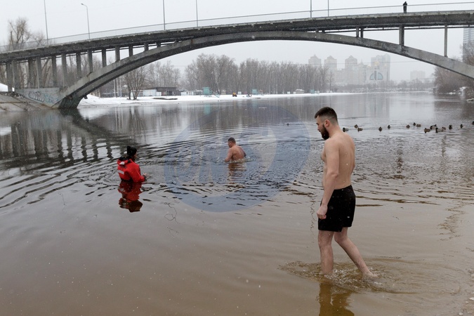 KYIV, UKRAINE - JANUARY 6, 2024 - Men bathe in the Dnipro River in Hidropark on Epiphany, Kyiv, capital of Ukraine., Credit:Kirill Chubotin / Avalon