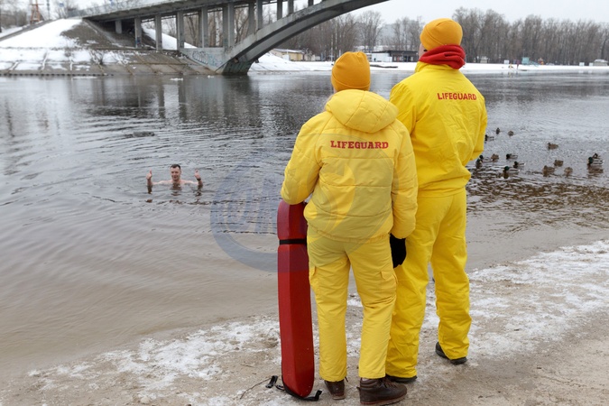 KYIV, UKRAINE - JANUARY 6, 2024 - Lifeguards are on duty during the Epiphany celebration in Hidropark, Kyiv, capital of Ukraine., Credit:Kirill Chubotin / Avalon