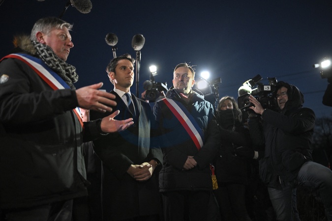 Le nouveau Premier ministre Gabriel Attal lors de son première déplacement dans le village de Clairmarais, pas de Calais, le 9 janvier 2024, village touché par les inondations. © Eliot Blondet/Pool/Bestimage New elected French Prime Minister Gabriel Attal during his first visit like Prime Minister in the village Clairmarais, Pas de Calais, on January 9, 2024, a village afected by floodings.