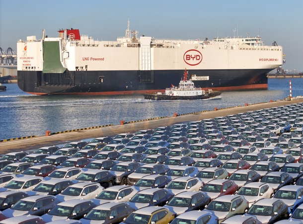 New BYD cars wait to be loaded onto a newly completed ro-ro ship named BYD Explorer No.1 for her maiden voyage in Yantai in east China's Shandong province Wednesday, Jan. 10, 2024. China's BYD has overtaken Tesla as the world's largest maker of pure-electric vehicles., Credit:TANG KE / Avalon