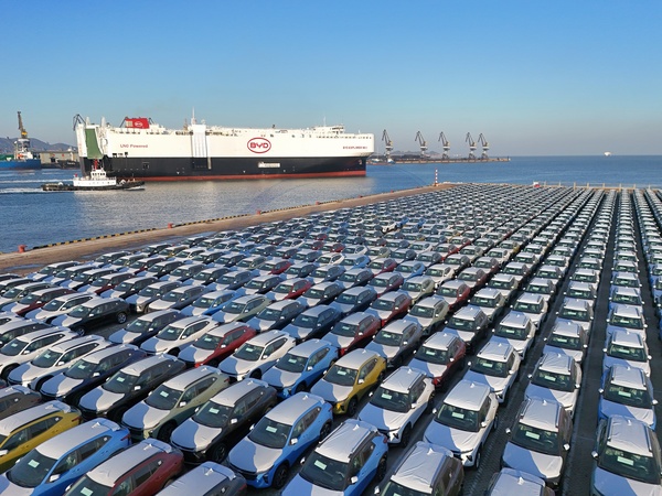 New BYD cars wait to be loaded onto a newly completed ro-ro ship named BYD Explorer No.1 for her maiden voyage in Yantai in east China's Shandong province Wednesday, Jan. 10, 2024. China's BYD has overtaken Tesla as the world's largest maker of pure-electric vehicles., Credit:TANG KE / Avalon