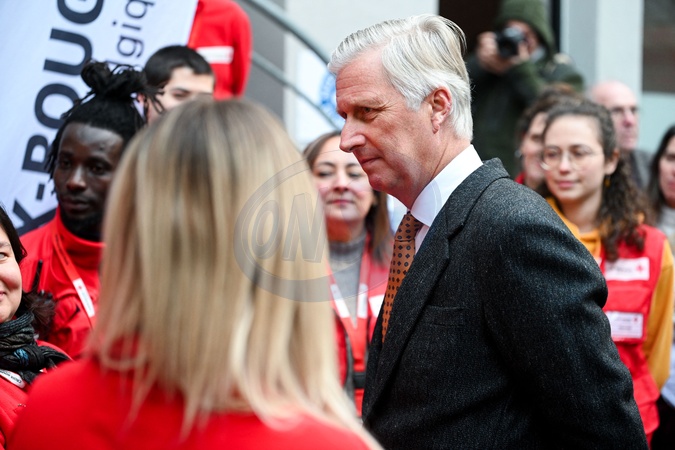 Le roi Philippe de Belgique en visite dans la structure d'accueil pour SDF "Train Hostel" à Schaerbeek. Le 10 janvier 2024 Belgium, Brussels, 10 January 2024 His Majesty the King Philippe of Belgium visits the "Train Hostel" winter shelter for homeless people run by the Red Cross. He talks to the management, staff and some of the homeless. The center provides short-term accommodation for 110 people.