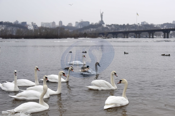 Swans on Dnipro embankment in Kyiv