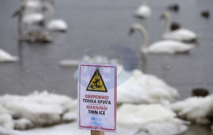 KYIV, UKRAINE - JANUARY 06, 2024 - Warning of thin ice near the Dnipro River on Dnipro embankment, Kyiv, capital of Ukraine., Credit:Ruslan Kanuka / Avalon