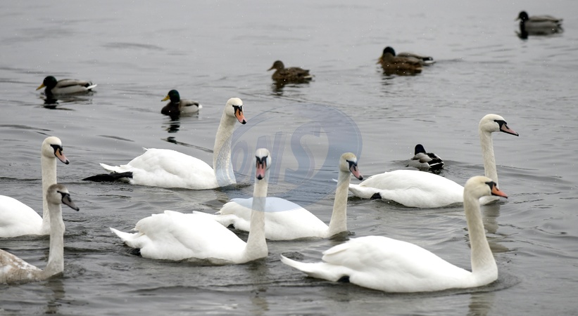 Swans on Dnipro embankment in Kyiv