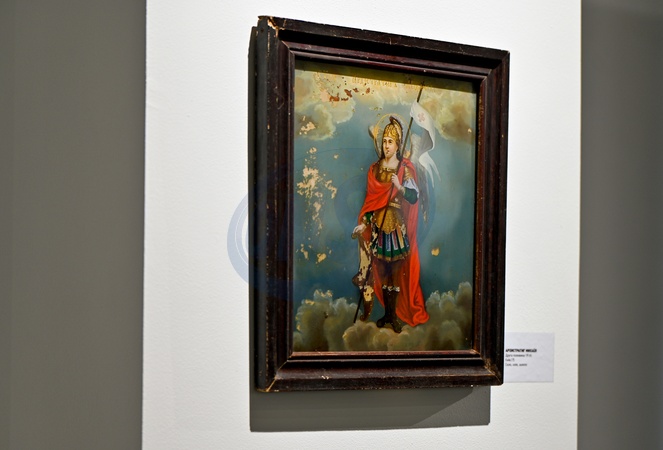 LVIV, UKRAINE - JANUARY 06, 2024 - An item presented during th eopening of the exhibition of folk icons on glass from the collection of Ostap Lozynskyi "More Fragile than Glass" at the Klymentii Sheptytskyi Museum of Folk Architecture and Rural Life, Lviv, western Ukraine., Credit:Anastasiia Smolienko / Avalon