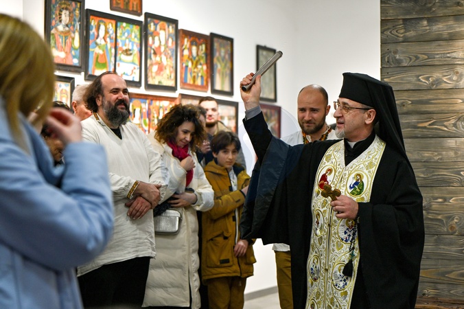 LVIV, UKRAINE - JANUARY 06, 2024 - A priest is seen during the opening of the exhibition of folk icons on glass from the collection of Ostap Lozynskyi "More Fragile than Glass" at the Klymentii Sheptytskyi Museum of Folk Architecture and Rural Life, Lviv, western Ukraine., Credit:Anastasiia Smolienko / Avalon