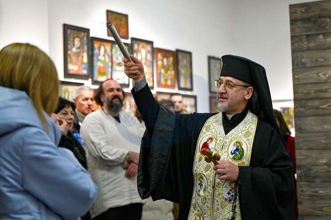 LVIV, UKRAINE - JANUARY 06, 2024 - A priest is seen during the opening of the exhibition of folk icons on glass from the collection of Ostap Lozynskyi "More Fragile than Glass" at the Klymentii Sheptytskyi Museum of Folk Architecture and Rural Life, Lviv, western Ukraine., Credit:Anastasiia Smolienko / Avalon