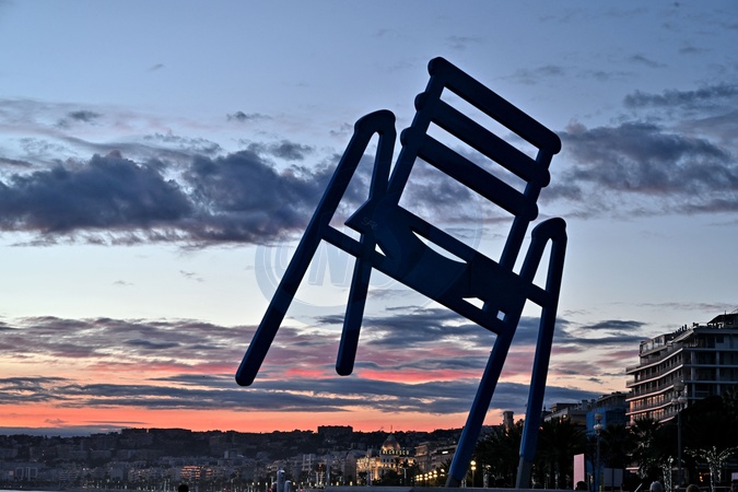 Illustration d'un coucher de soleil sur la Promenade des Anglais à Nice, le 6 janvier 2024. Ici, la Chaise Bleue de SAB. © Bruno Bebert / Bestimage Illustration of a sunset on the Promenade des Anglais in Nice in January 2024.