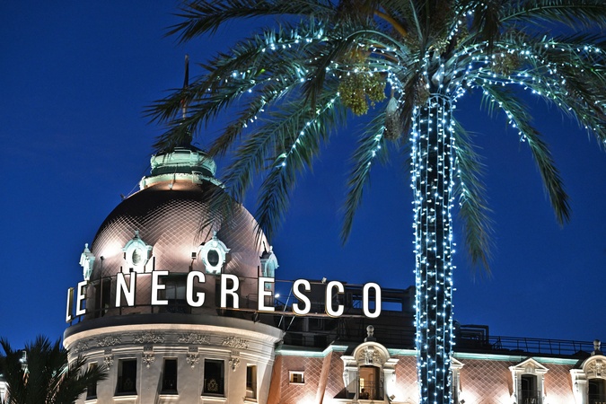 Illustration d'un coucher de soleil sur la Promenade des Anglais à Nice, le 6 janvier 2024. Ici, l'hôtel Negresco. © Bruno Bebert / Bestimage Illustration of a sunset on the Promenade des Anglais in Nice in January 2024.