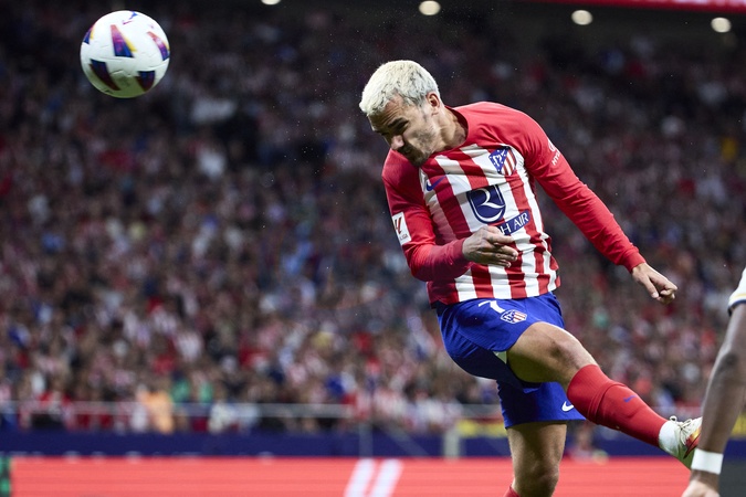 Info - Antoine Griezmann, nouveau meilleur buteur de tous les temps de l'Atlético de Madrid - Antoine Griezmann of Atletico de Madrid heads the ball during the LaLiga EA Sports match between Atletico de Madrid and Real Madrid Cf at Civitas Metropolitano Stadium, in Madrid, Spain, on September 23, 2023.