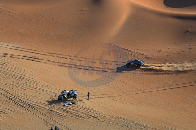 200 AL-ATTIYAH Nasser (qat), BAUMEL Mathieu (fra), Nasser Racing, Prodrive Hunter, FIA Ultimate, FIA W2RC, having a mechanical problem with SAINZ Carlos (spa), Team Audi Sport, Audi RS Q E-Tron E2, FIA Ultimate, FIA W2RC, passing in the background during the Stage 6 «48 Hours Chrono» of the Dakar 2024 from January 11 to 12, 2024 around Subaytah, Saudi Arabia. © Eric Vargiolu/DPPI/Bestimage