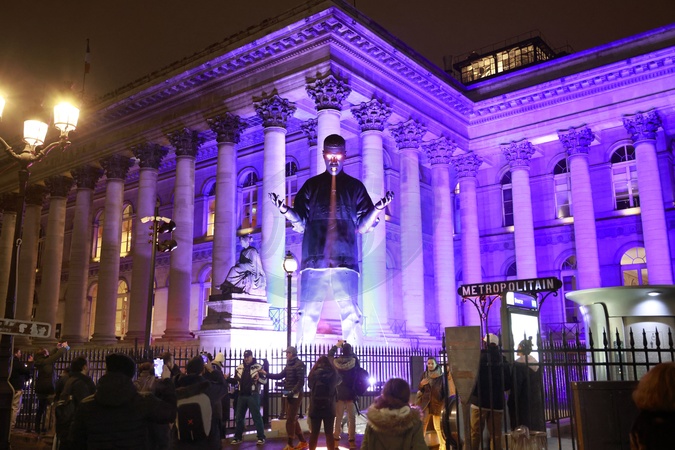 Gigantyczny efemeryczny pomnik amerykańskiego rapera Kid Cudi zainstalowany na Place de la Bourse z okazji jego nowego albumu w Paryżu