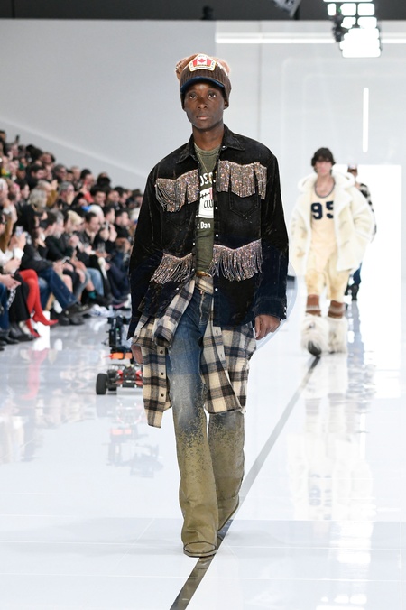 DSquared2 Model On Catwalk, Men, Milan Fashion Week 2024 Man Ready To Wear For Fall Winter, Defile, Fashion Show Runway Collection, Pret A Porter, Modelwear, Modeschau, Man, Laufsteg Hebet Winter Autumn Italycatwalk fashion outlook beauty runway menMILMFW24, Credit:www.fashionpps.com / Avalon