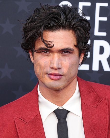 SANTA MONICA, LOS ANGELES, CALIFORNIA, USA - JANUARY 14: Charles Melton wearing a Valentino suit and shoes, Maria Tash earrings and an Omega watch arrives at the 29th Annual Critics' Choice Awards held at The Barker Hangar on January 14, 2024 in Santa Monica, Los Angeles, California, United States., Credit:Xavier Collin / Avalon