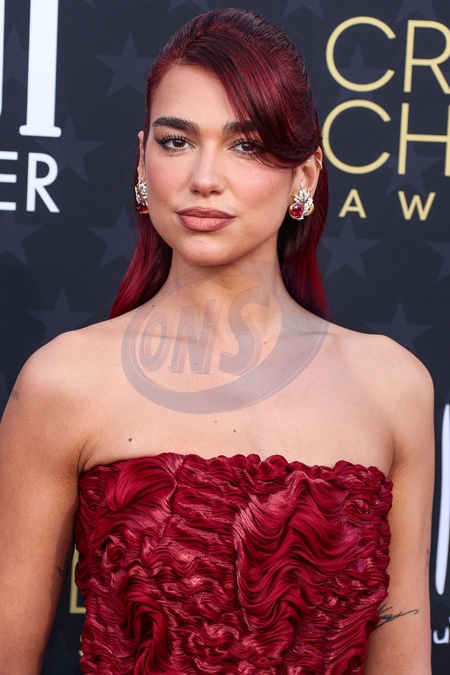 SANTA MONICA, LOS ANGELES, CALIFORNIA, USA - JANUARY 14: Dua Lipa wearing a custom Prada dress, Prada shoes and bag, and Tiffany and Co. jewelry arrives at the 29th Annual Critics' Choice Awards held at The Barker Hangar on January 14, 2024 in Santa Monica, Los Angeles, California, United States., Credit:Xavier Collin / Avalon