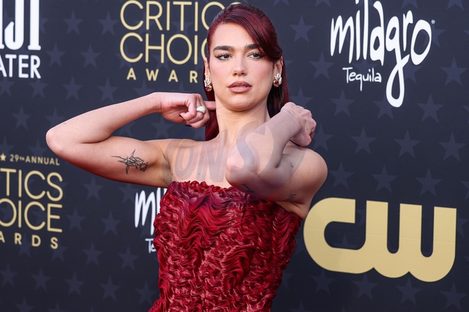 SANTA MONICA, LOS ANGELES, CALIFORNIA, USA - JANUARY 14: Dua Lipa wearing a custom Prada dress, Prada shoes and bag, and Tiffany and Co. jewelry arrives at the 29th Annual Critics' Choice Awards held at The Barker Hangar on January 14, 2024 in Santa Monica, Los Angeles, California, United States., Credit:Xavier Collin / Avalon