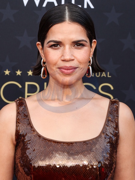SANTA MONICA, LOS ANGELES, CALIFORNIA, USA - JANUARY 14: America Ferrera wearing a custom Alberta Ferretti dress with Pomellato jewelry and a Tyler Ellis clutch arrives at the 29th Annual Critics' Choice Awards held at The Barker Hangar on January 14, 2024 in Santa Monica, Los Angeles, California, United States., Credit:Xavier Collin / Avalon
