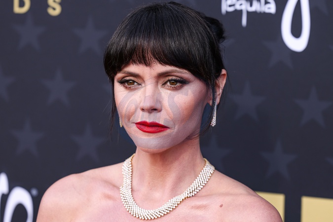 SANTA MONICA, LOS ANGELES, CALIFORNIA, USA - JANUARY 14: Christina Ricci wearing a custom Astsuko dress, Tamara Mellon shoes, a Carolina Herrera bag, and Bucherer jewelry arrives at the 29th Annual Critics' Choice Awards held at The Barker Hangar on January 14, 2024 in Santa Monica, Los Angeles, California, United States., Credit:Xavier Collin / Avalon