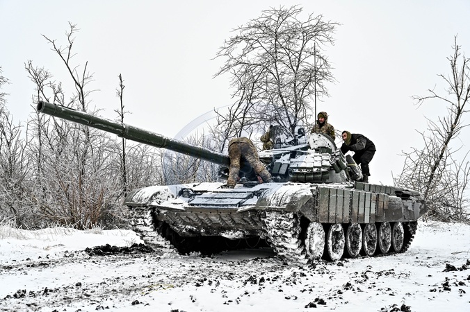 ZAPORIZHZHIA SECTOR, UKRAINE - JANUARY 11, 2024 - A T-72 tank is seen during special training of the soldiers of the 128th separate mountain assault brigade of the Zakarpattia Army of the Armed Forces of Ukraine to maintain professional skills, Zaporizhzhia sector, south-eastern Ukraine., Credit:Dmytro Smolienko / Avalon
