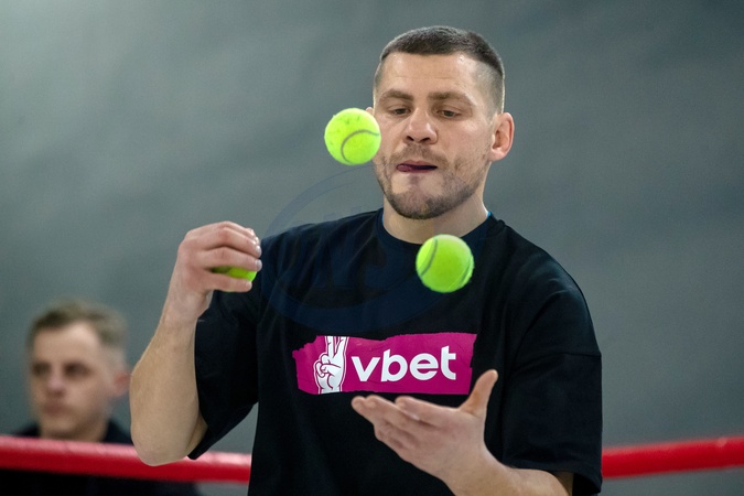 KYIV, UKRAINE - JANUARY 16, 2024 - Boxer, WBO International lightweight champion Denys Berinchyk juggles tennis balls during an open training session, Kyiv, capital of Ukraine., Credit:Pavlo_Bagmut / Avalon