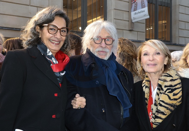 Pierre Richard et sa femme Ceyla Lacerda et Ruth Obadia - Dévoilement d'une plaque en hommage à Kenzo Takada saluant l'héritage du créateur japonais décédé en 2020 devant la Galerie Vivienne à Paris le 16 janvier 2024. © Coadic Guirec/Bestimage Unveiling of a plaque in tribute to Kenzo Takada saluting the legacy of the Japanese designer who died in 2020 in front of the Galerie Vivienne in Paris on January 16, 2024.