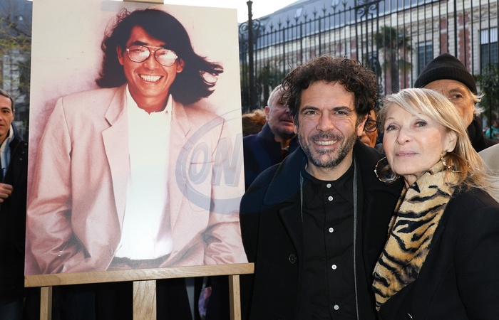 Dévoilement d'une plaque en hommage à Kenzo Takada saluant l'héritage du créateur japonais décédé en 2020 devant la Galerie Vivienne à Paris