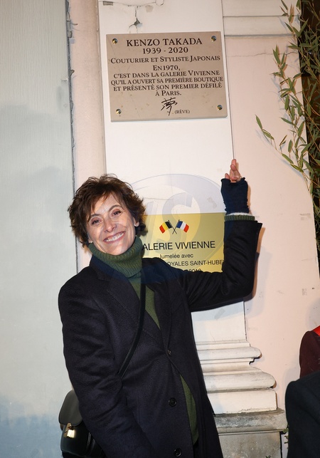 Inès de La Fressange - Dévoilement d'une plaque en hommage à Kenzo Takada saluant l'héritage du créateur japonais décédé en 2020 devant la Galerie Vivienne à Paris le 16 janvier 2024. © Coadic Guirec/Bestimage Unveiling of a plaque in tribute to Kenzo Takada saluting the legacy of the Japanese designer who died in 2020 in front of the Galerie Vivienne in Paris on January 16, 2024.