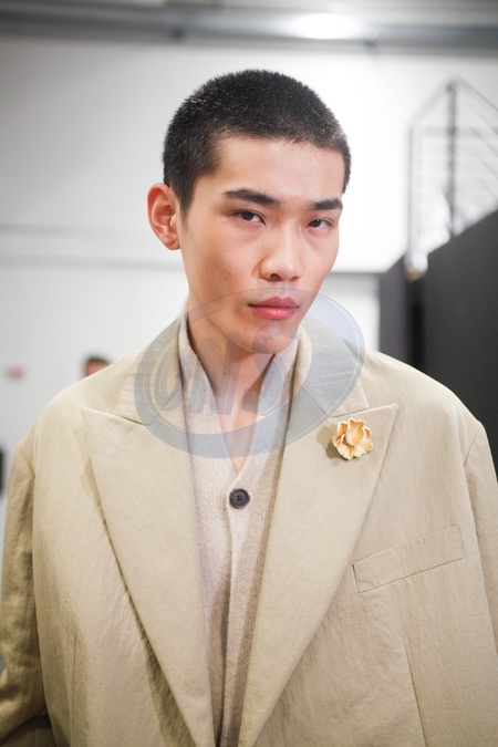 Emporio Armani Model On Backstage, Men, Milan Fashion Week 2024 Man Ready To Wear For Fall Winter, Fashion Show , Pret A Porter, Man, Herbst Winter Autumn Italyfashion outlook beauty face hair eyes makeup menMILMFW24, Credit:www.fashionpps.com / Avalon