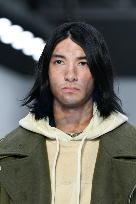DSquared2 Model On Catwalk, Men, Milan Fashion Week 2024 Man Ready To Wear For Fall Winter, Defile, Fashion Show Runway Collection, Pret A Porter, Modelwear, Modeschau, Man, Laufsteg Hebet Winter Autumn Italycloseup, accessories, details, face, hair, eyes catwalk fashion outlook beauty runway menMILMFW24, Credit:www.fashionpps.com / Avalon