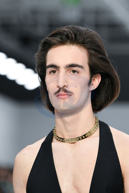 DSquared2 Model On Catwalk, Men, Milan Fashion Week 2024 Man Ready To Wear For Fall Winter, Defile, Fashion Show Runway Collection, Pret A Porter, Modelwear, Modeschau, Man, Laufsteg Hebet Winter Autumn Italycloseup, accessories, details, face, hair, eyes catwalk fashion outlook beauty runway menMILMFW24, Credit:www.fashionpps.com / Avalon