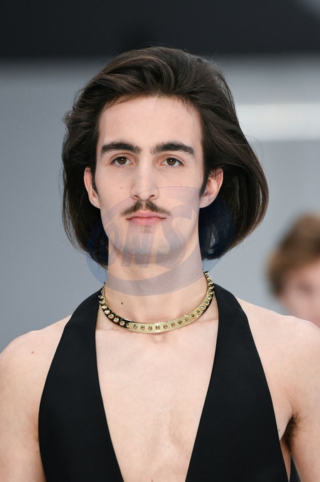 DSquared2 Model On Catwalk, Men, Milan Fashion Week 2024 Man Ready To Wear For Fall Winter, Defile, Fashion Show Runway Collection, Pret A Porter, Modelwear, Modeschau, Man, Laufsteg Hebet Winter Autumn Italycloseup, accessories, details, face, hair, eyes catwalk fashion outlook beauty runway menMILMFW24, Credit:www.fashionpps.com / Avalon