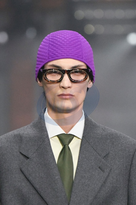 Prada Model On Catwalk, Men, Milan Fashion Week 2024 Man Ready To Wear For Fall Winter, Defile, Fashion Show Runway Collection, Pret A Porter, Modelwear, Modeschau, Man, Laufsteg Hebet Winter Autumn Italycloseup, accessories, details, face, hair, eyes catwalk fashion outlook beauty runway menMILMFW24, Credit:www.fashionpps.com / Avalon