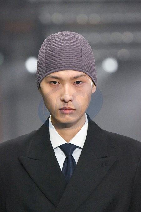 Prada Model On Catwalk, Men, Milan Fashion Week 2024 Man Ready To Wear For Fall Winter, Defile, Fashion Show Runway Collection, Pret A Porter, Modelwear, Modeschau, Man, Laufsteg Hebet Winter Autumn Italycloseup, accessories, details, face, hair, eyes catwalk fashion outlook beauty runway menMILMFW24, Credit:www.fashionpps.com / Avalon