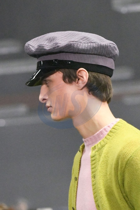 Prada Model On Catwalk, Men, Milan Fashion Week 2024 Man Ready To Wear For Fall Winter, Defile, Fashion Show Runway Collection, Pret A Porter, Modelwear, Modeschau, Man, Laufsteg Hebet Winter Autumn Italycloseup, accessories, details, face, hair, eyes catwalk fashion outlook beauty runway menMILMFW24, Credit:www.fashionpps.com / Avalon