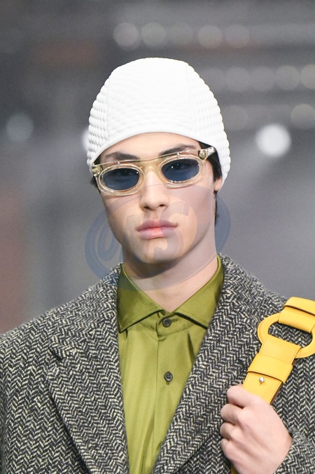 Prada Model On Catwalk, Men, Milan Fashion Week 2024 Man Ready To Wear For Fall Winter, Defile, Fashion Show Runway Collection, Pret A Porter, Modelwear, Modeschau, Man, Laufsteg Hebet Winter Autumn Italycloseup, accessories, details, face, hair, eyes catwalk fashion outlook beauty runway menMILMFW24, Credit:www.fashionpps.com / Avalon