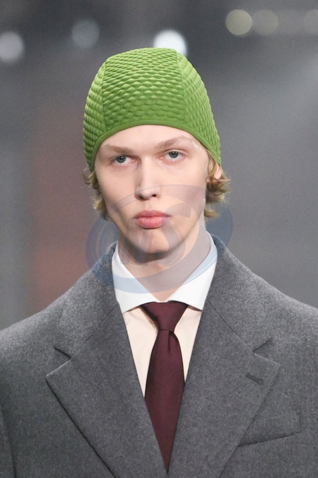 Prada Model On Catwalk, Men, Milan Fashion Week 2024 Man Ready To Wear For Fall Winter, Defile, Fashion Show Runway Collection, Pret A Porter, Modelwear, Modeschau, Man, Laufsteg Hebet Winter Autumn Italycloseup, accessories, details, face, hair, eyes catwalk fashion outlook beauty runway menMILMFW24, Credit:www.fashionpps.com / Avalon