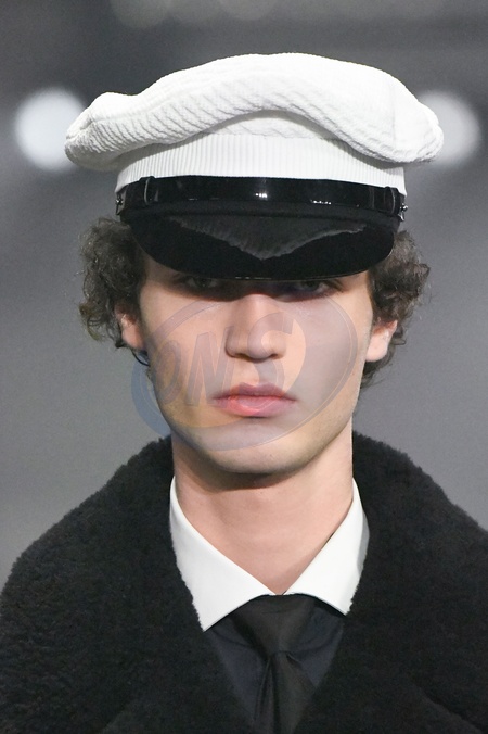 Prada Model On Catwalk, Men, Milan Fashion Week 2024 Man Ready To Wear For Fall Winter, Defile, Fashion Show Runway Collection, Pret A Porter, Modelwear, Modeschau, Man, Laufsteg Hebet Winter Autumn Italycloseup, accessories, details, face, hair, eyes catwalk fashion outlook beauty runway menMILMFW24, Credit:www.fashionpps.com / Avalon