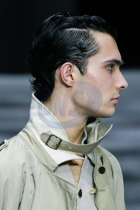Emporio Armani Model On Catwalk, Men, Milan Fashion Week 2024 Man Ready To Wear For Fall Winter, Defile, Fashion Show Runway Collection, Pret A Porter, Modelwear, Modeschau, Man, Laufsteg Hebet Winter Autumn Italycloseup, accessories, details, face, hair, eyes catwalk fashion outlook beauty runway menMILMFW24, Credit:www.fashionpps.com / Avalon