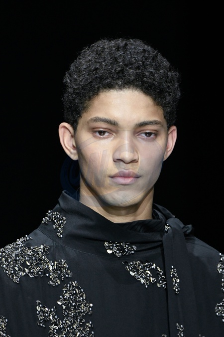 Emporio Armani Model On Catwalk, Men, Milan Fashion Week 2024 Man Ready To Wear For Fall Winter, Defile, Fashion Show Runway Collection, Pret A Porter, Modelwear, Modeschau, Man, Laufsteg Hebet Winter Autumn Italycloseup, accessories, details, face, hair, eyes catwalk fashion outlook beauty runway menMILMFW24, Credit:www.fashionpps.com / Avalon