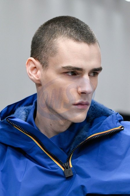 K way Model On Catwalk, Men, Milan Fashion Week 2024 Man Ready To Wear For Fall Winter, Defile, Fashion Show Runway Collection, Pret A Porter, Modelwear, Modeschau, Man, Laufsteg Hebet Winter Autumn Italycloseup, accessories, details, face, hair, eyes catwalk fashion outlook beauty runway menMILMFW24, Credit:www.fashionpps.com / Avalon