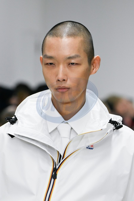 K way Model On Catwalk, Men, Milan Fashion Week 2024 Man Ready To Wear For Fall Winter, Defile, Fashion Show Runway Collection, Pret A Porter, Modelwear, Modeschau, Man, Laufsteg Hebet Winter Autumn Italycloseup, accessories, details, face, hair, eyes catwalk fashion outlook beauty runway menMILMFW24, Credit:www.fashionpps.com / Avalon