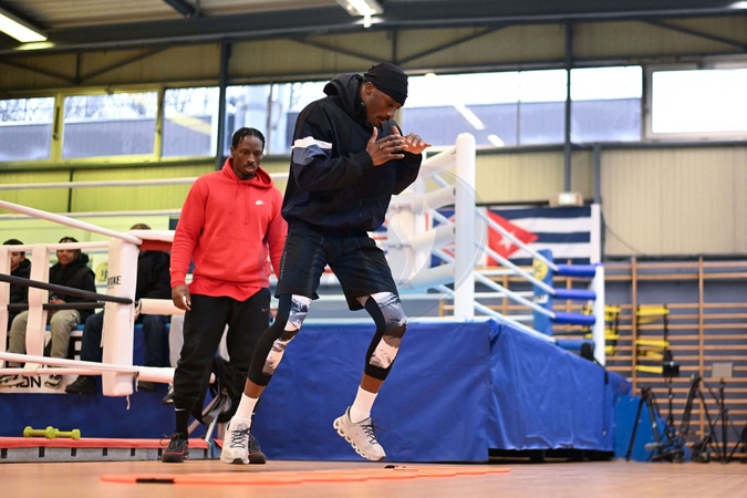 Boxer Bakary Samake trenuje w sali bokserskiej IBC w Champs sur Marne.