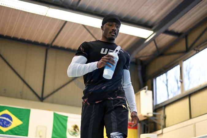Boxer Bakary Samake trenuje w sali bokserskiej IBC w Champs sur Marne.