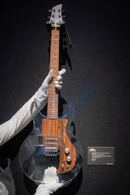 A technician holds up a '1971 Dan Armstrong lucite solid body guitar' (est. £2,000 - £4,000) as part of Christie's 'The Mark Knopfler Guitar Collection' Auction on 31st January 2024 - Christie's King Street, London, England, UK on Thursday 18 January, 2024., Credit:Justin Ng / Avalon