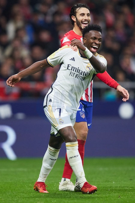 L'Atletico de Madrid bat le Real de Madrid (4-2) lors des huitièmes de finale de la Copa del Rey, la Coupe d'Espagne à Madrid le 18 janvier 2024. Mario Hermoso of Atletico de Madrid talks to Vinicius Junior of Real Madrid CF (R) during the King's Cup Quarter Final match between Atletico de Madrid and Real Madrid CF at Civitas Metropolitano on January 18, 2024 in Madrid, Spain (Photo by: Alvaro Medranda/ Panoramic)