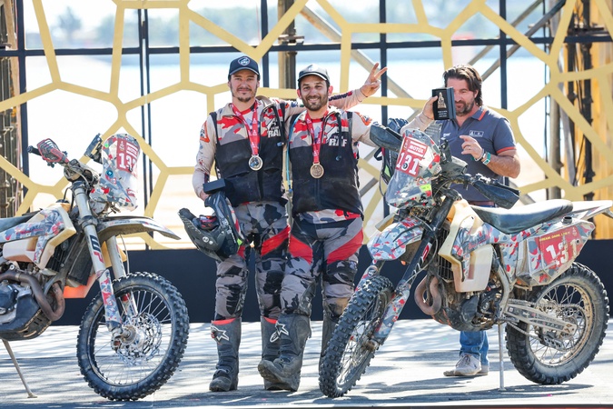 131 FABRE Anthony (fra), Team ARF, KTM, Moto, Originals by Motul, 132 BEAUCOUD Andy (fra), Team RAF, Husqvarna, Moto, Originals by Motul, during the Final Podium of the Dakar 2024 on January 19, 2024 in Yanbu, Saudi Arabia -